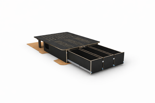 Onze camperbox is gemaakt van 15 mm populieren betonplex: licht, sterk en afgewerkt met een robuuste, moderne uitstraling.